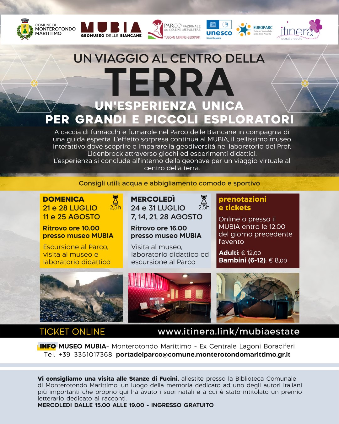 A caccia di fumacchi e fumarole nel Parco delle Biancane in compagnia di una guida esperta. L’effetto sorpresa continua al MUBIA, il bellissimo museo interattivo dove scoprire e imparare la geodiversità nel laboratorio del Prof. Lidenbrock attraverso giochi ed esperimenti didattici. L’esperienza si conclude all’interno della geonave per un viaggio virtuale al centro della terra.